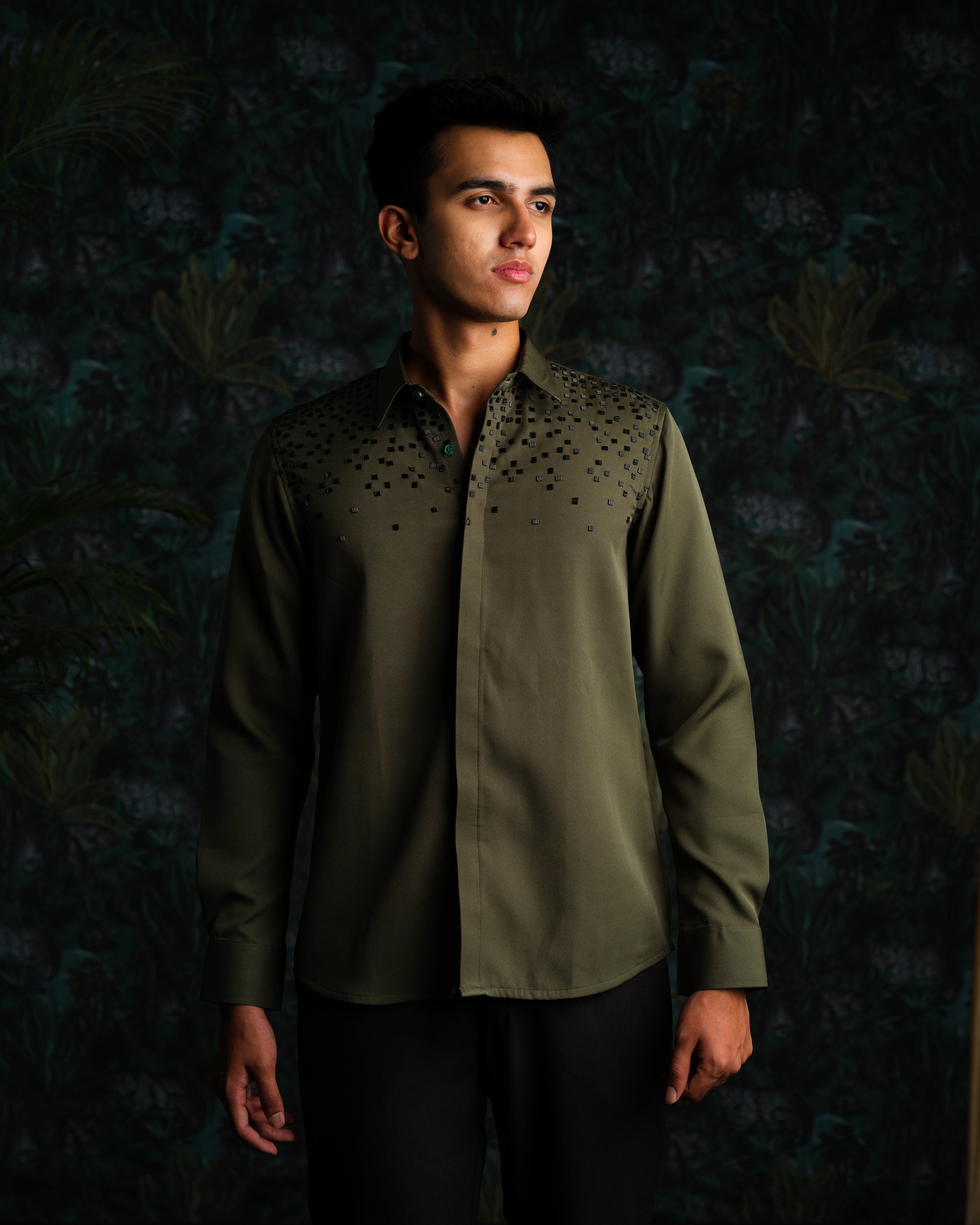 Olive green italian banana crepe shirt with abstract embroidery