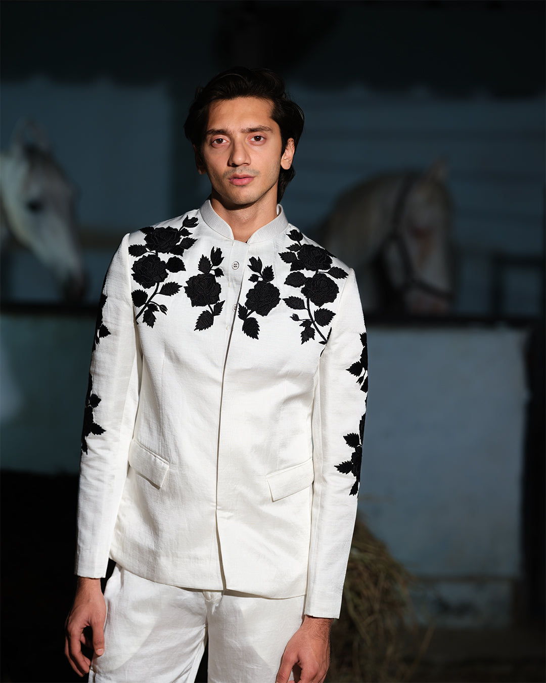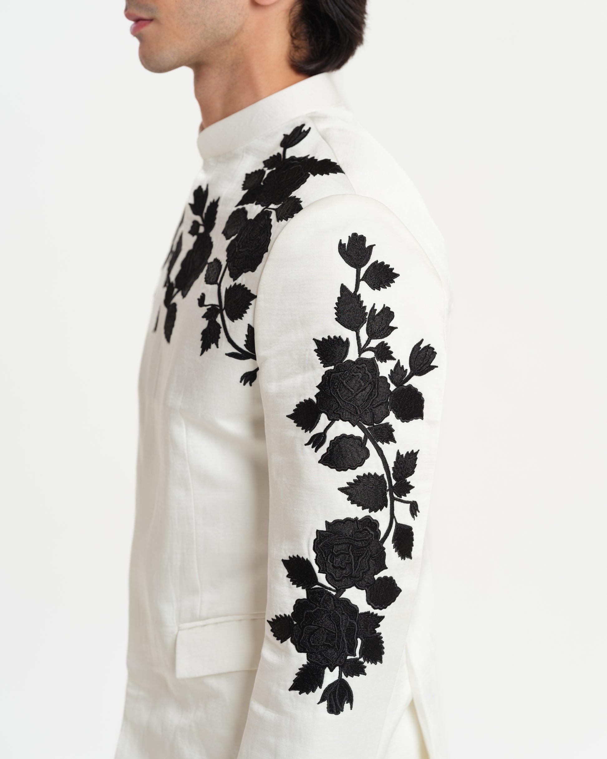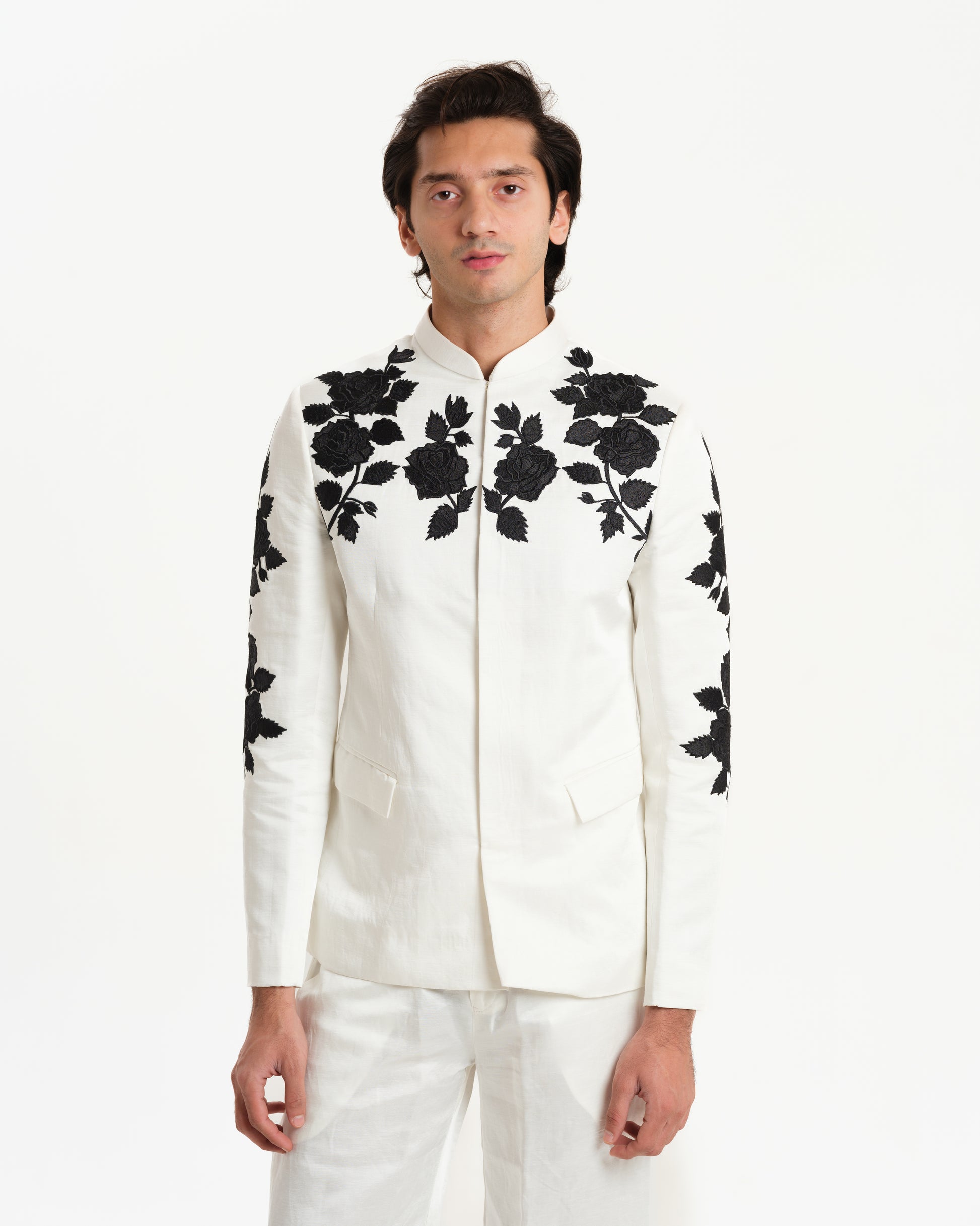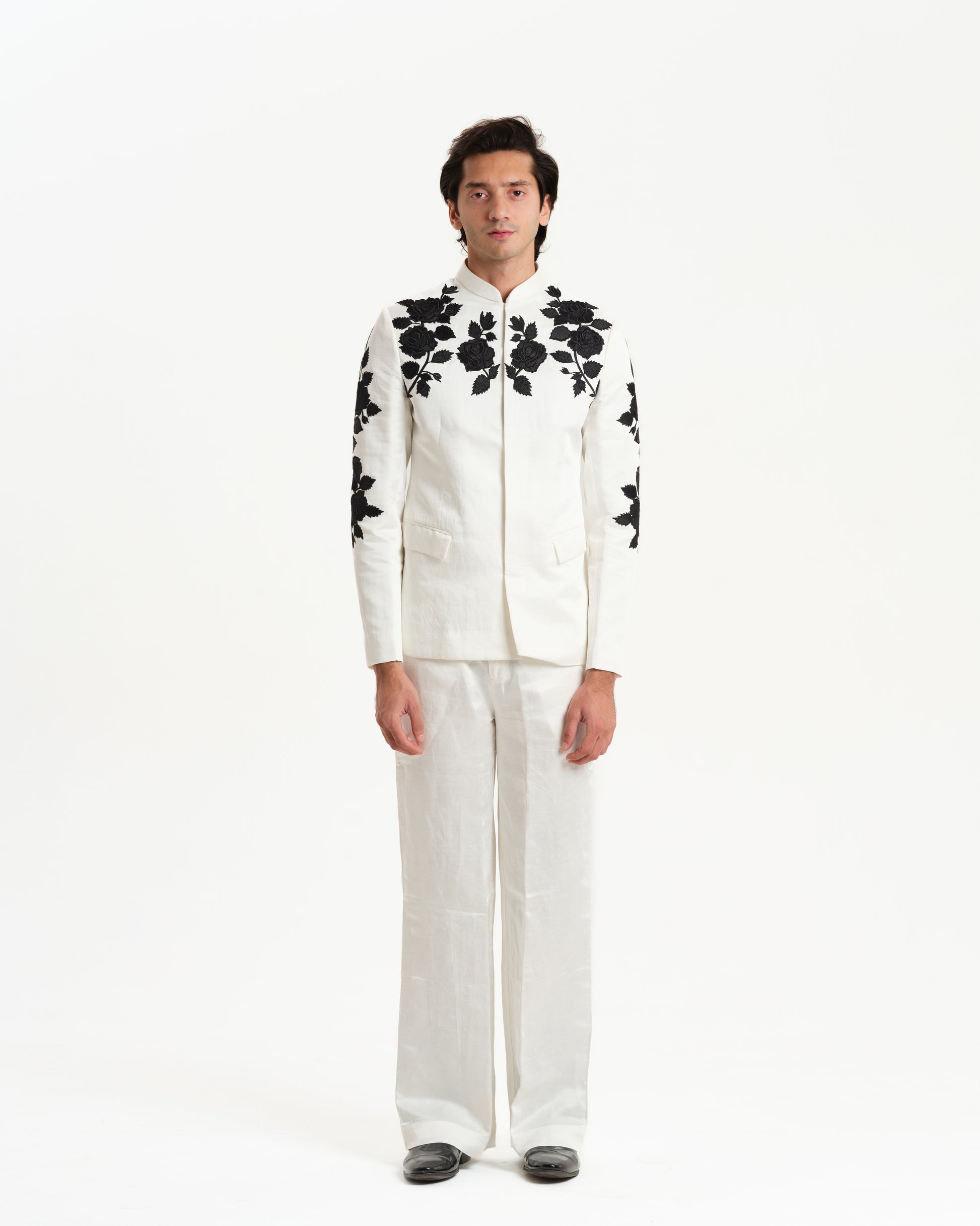 Linen satin bandhgala with floral rose embroidery paired with linen satin pants