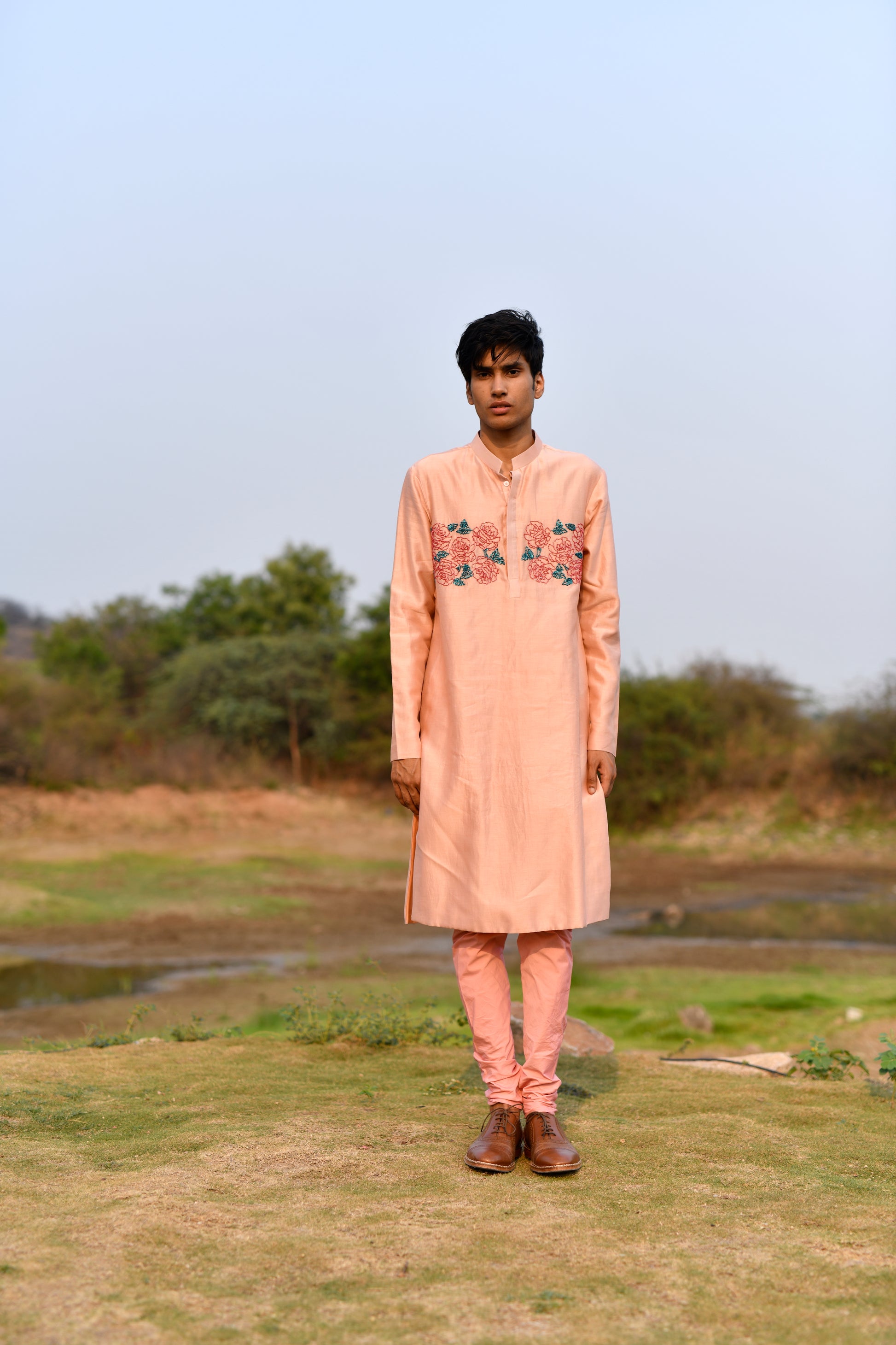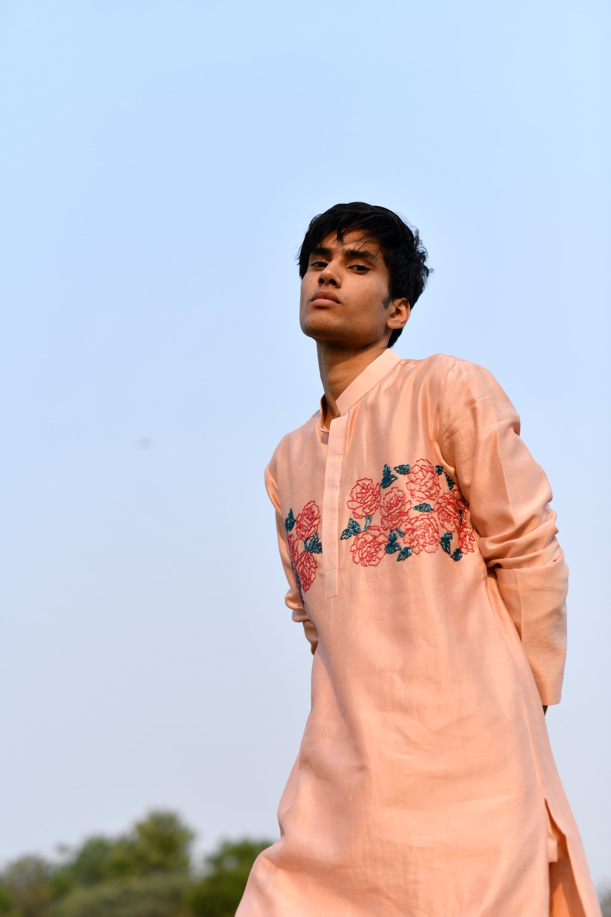 Pink chanderi kurta with rose embroidred cutdana motif paired with stretch cotton pants