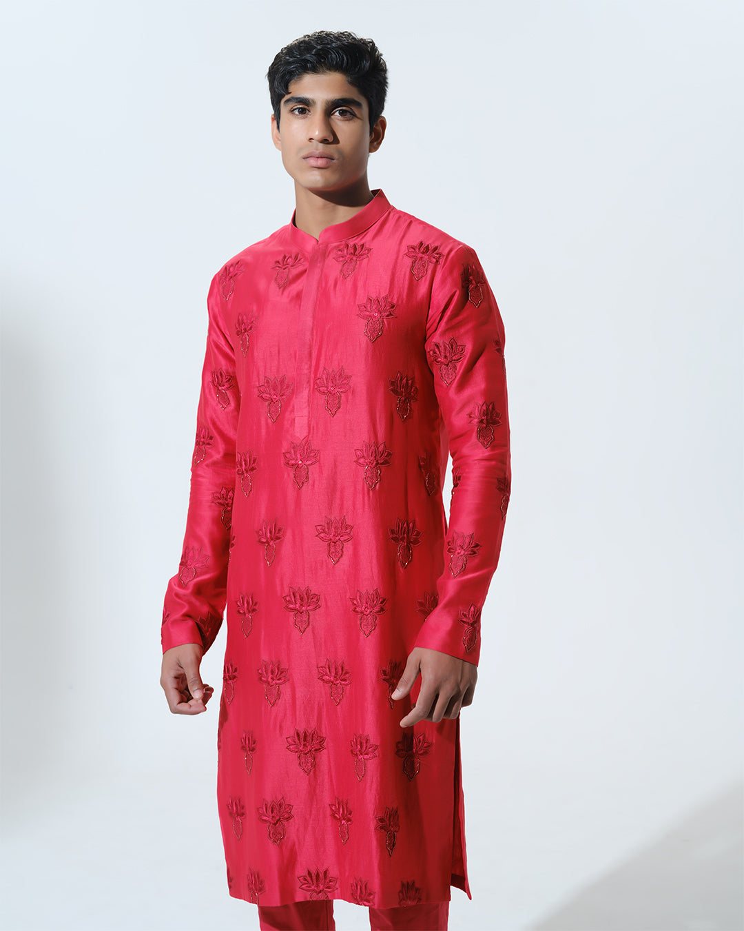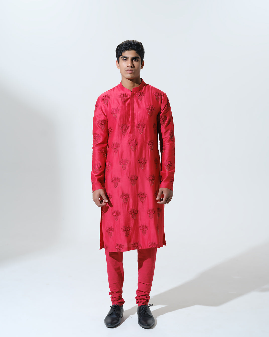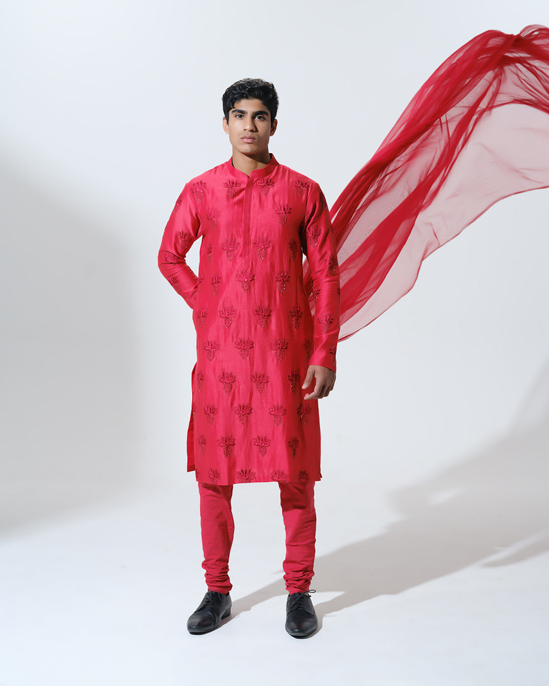 RED CHANDARI KURTA WITH MACHINE EMBROIDED RED LOUTS BUTAS